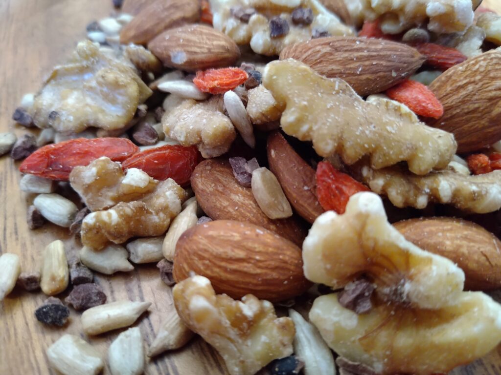 アーモンド、くるみ、ひまわりの種、クコの実、カカオニブが入っていて、ビタミンC、ビタミンE、鉄分、葉酸、不飽和脂肪酸がとれるのよ!